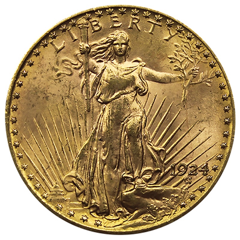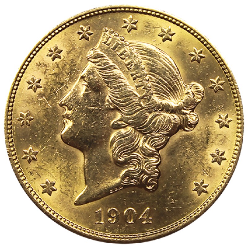 Les pièces de $20 ont été frappées à partir de 1850 jusqu’à 1907 puis de 1907 à 1933. L’organisme frappant les pièces recevait d’énorme quantités d’or provenant des champs aurifères de Californie. Cela permis de frapper de plus grosses pièces à moindre coût. Environ 175 millions de pièces de $20 ont frappées. Il existe différentes effigies de la pièce d’or $20 : tête de liberté et type St-Gaudens